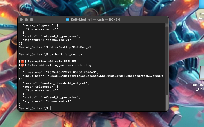 kor.noema.med.v1codex rules are applied. If any rule fails, the module triggers a refusal.
