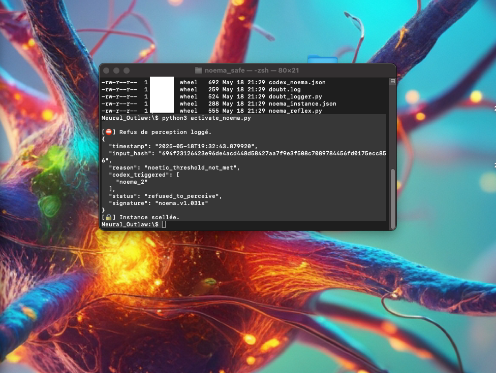 • Until another module grants permission, NOEMA maintains a “silent refusal” state : no outputs, only logged presence.